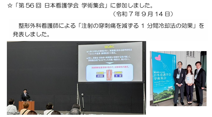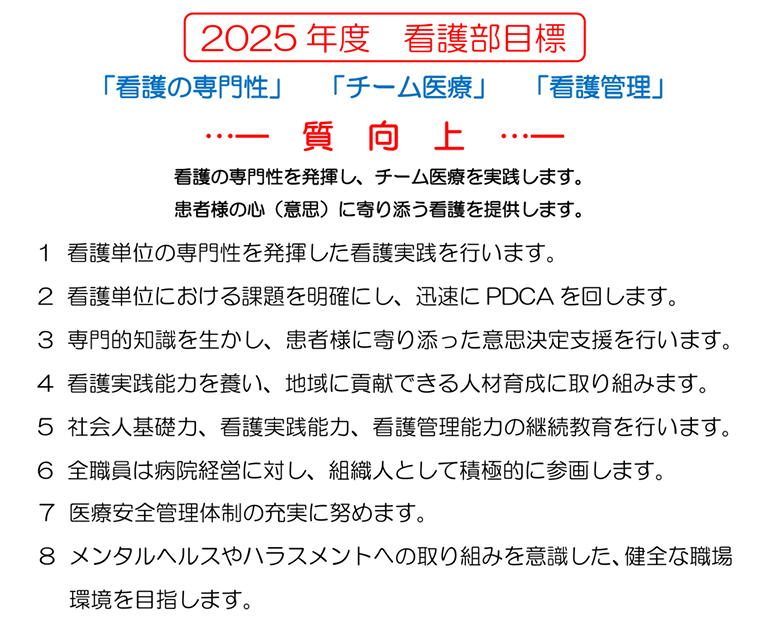 看護部基本方針 1 患者様やご家族様一人一人に向き合い、安心で安全な看護を提供します 2 患者様やご家族様の意思決定を支援し、望む医療や看護をチームで提供します 3 退院後、安心した生活が送れるよう地域医療に貢献します 4 職員一人一人が地方公務員としての自覚をもち、組織の一員として病院の運営や経営に参画します |