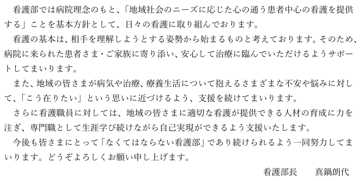 看護部の理念 病院の理念を基盤とし、地域社会のニーズに応じた心の通う患者様中心の看護を提供する。 |